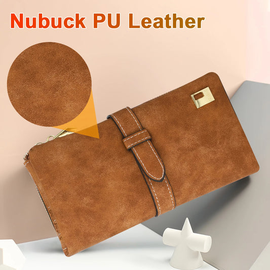 • Vegan Leather Wallet,  Long Wallet with Multi-Cards for Women, Slim Bifold Purse, Card Holder with Snap, Brown